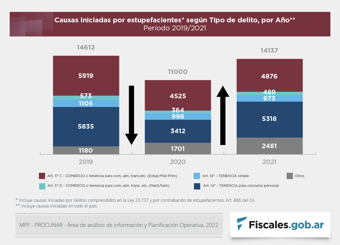 La PROCUNAR estima que las causas por TCP iniciadas en 2021 aumentaron en relación al 2020 debido al restablecimiento de la circulación como al cambio en las tareas asignadas a la agencia policial durante las distintas fases de aislamiento por la pandemia. La procuraduría especializada señaló que este conjunto de casos había disminuido como resultado de la reorientación de las funciones de las fuerzas de seguridad tanto federales como provinciales -cuya labor da origen a la mayoría de las causas por drogas-, que se direccionaron al control del cumplimiento de las medidas sanitarias dispuestas y al impedimento de la circulación y presencia de personas en la vía pública, espacio donde se detecta la mayor cantidad de casos de TCP.