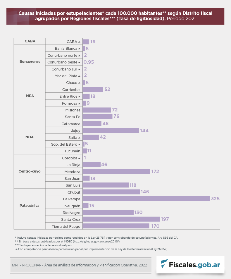 Una parte significativa del abordaje penal en la materia no se encuentra reflejado, dado que son varias las provincias, junto con la Ciudad Autónoma de Buenos Aires (CABA), que tienen bajo su jurisdicción la competencia penal de ciertos delitos comprendidos en la ley 23.737, tras haber implementado la Ley de Desfederalización (ley 26.052). Es por esto que algunos distritos presentan menores tasas de litigiosidad, al investigarse buena parte de los hechos en su fuero local.