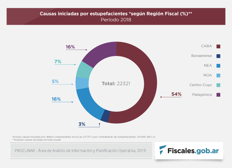 Del relevamiento realizado por la procuraduría especializada surge que más de la mitad de las causas por delitos vinculados a estupefacientes se inició en la justicia federal de la Ciudad Autónoma de Buenos Aires; por debajo le siguen las regiones noreste y patagónica, con un 16% de los casos cada una.