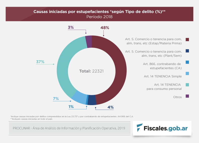 La Procuraduría de Narcocriminalidad (PROCUNAR) amplió el contenido de la base de datos pública sobre las causas por estupefacientes, que comprendía a las iniciadas entre 2011 y 2016, al incluir ahora a las comenzadas hasta 2018 inclusive. El sistema contempla todas las regiones del país y permite discriminar por tipo de delito, año de inicio y localización geográfica, entre otras variables, y además refleja los resultados en gráficos estadísticos. La plataforma se encuentra disponible en el sitio web de la procuraduría que encabeza el fiscal federal Diego Iglesias, y se puede acceder también directamente desde el enlace https://pes.mpf.gov.ar/.