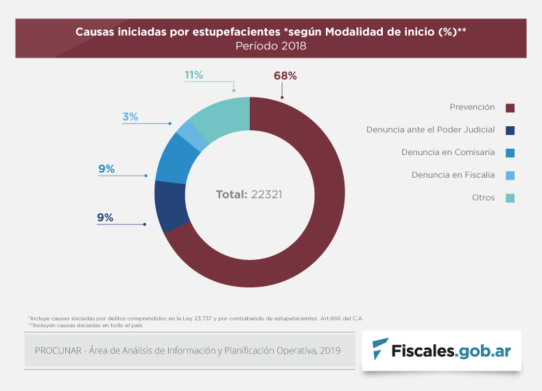 Respecto de la forma en que se iniciaron las causas, la mayoría fue por tareas preventivas de las fuerzas de seguridad (FFSS). Esta variable observó un aumento significativo de aquellas iniciadas por tareas preventivas en relación a años anteriores. La Procuraduría estimó que ello está completamente relacionado con la incidencia de causas por tenencia para consumo personal, en su mayoría iniciadas por tareas de prevención dada la persecución de casos de flagrancia por parte de las FFSS.