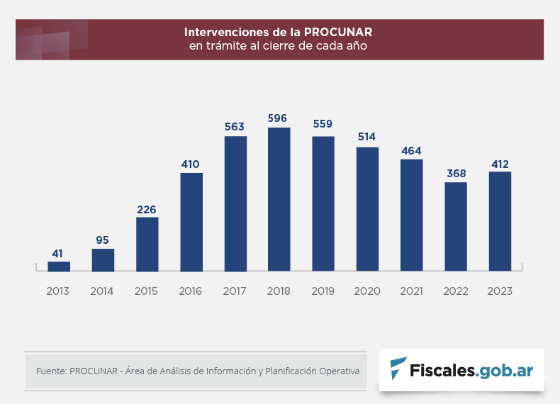 Desde su creación hace diez años, la PROCUNAR ha promovido el diseño de estrategias de persecución penal y la generación de investigaciones focalizadas, a fin de mejorar la persecución y apoyar eficazmente la tarea de los y las fiscales intervinientes. En todos estos años la oficina especializada intervino en 2616 casos –de las cuales 230 se iniciaron en 2023– entre colaboraciones, investigaciones preliminares, causas delegadas e investigaciones autónomas. Asimismo, viene prestando colaboración con más de 100 fiscalías con competencia penal en todo el país.