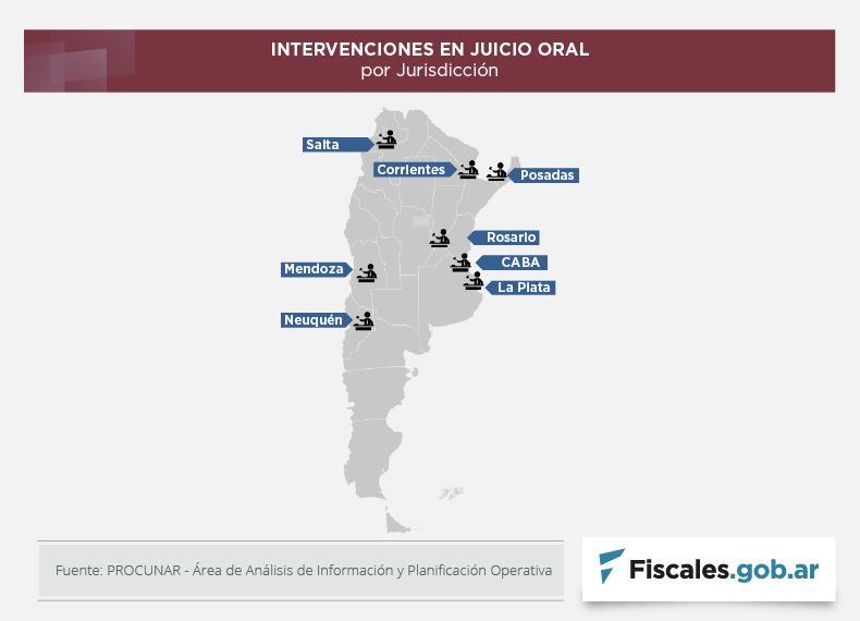 Durante 2022 y 2023, la procuraduría se propuso priorizar la asistencia en los juicios orales respecto de investigaciones iniciadas en años anteriores y seguidos contra organizaciones de gran envergadura, complejidad y/o relevancia institucional. Algunos de los juicios orales más relevantes en los que los fiscales de la PROCUNAR tomaron intervención fueron: Villa 1-11-14 (CFP 2824/21) con intervención del Tribunal Oral Federal (TOF) N°3 porteño, Corrupción judicial de Corrientes (CFP 9886/18) con intervención del TOF de Corrientes y Caso Rodríguez Granthon (FRO 10716/21) con intervención del TOF 2 de Rosario.