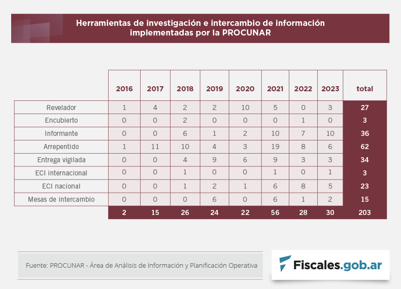 El trabajo de la PROCUNAR, tras la sanción de las leyes 27.304 y 27.319 a fin de 2016, que proporcionaron herramientas y facultades para ser aplicadas a la investigación, la prevención y la intervención frente a los delitos complejos -regularon las figuras del arrepentido, el agente encubierto, el agente revelador, el informante, la entrega vigilada y la prórroga de jurisdicción-, se enfocó en promover el uso de estas figuras para maximizar los resultados de las investigaciones.