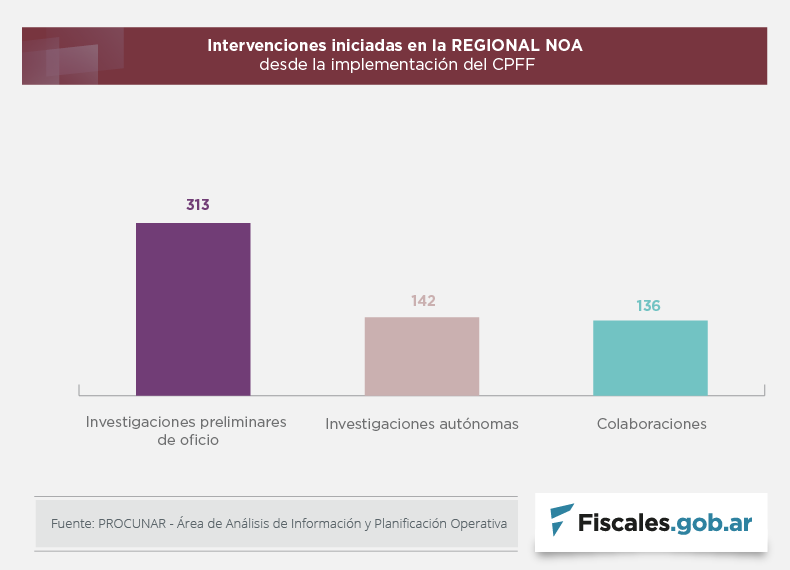Desde la implementación del sistema adversarial en Salta y Jujuy en junio de 2019, la Regional NOA de la PROCUNAR ha venido desarrollando investigaciones preliminares y colaboraciones, pero además ha incorporado las investigaciones autónomas como una nueva forma de intervenir en casos, de acuerdo a lo establecido en los artículos 19 inciso h) y 24 inciso a) de la Ley Orgánica del MPF. En ese período, la oficina regional ha iniciado un total de 313 investigaciones preliminares de oficio (IPO), 142 investigaciones autónomas (IPF) y 136 colaboraciones.