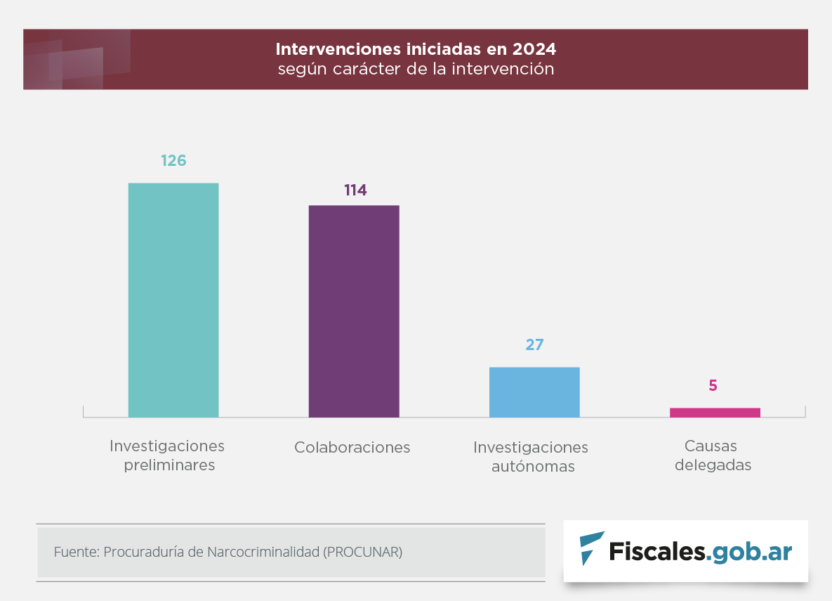 Así, de las cifras relevadas por el Área de Análisis de Información y Planificación Operativa, se desprende que en 2024 la PROCUNAR realizó 272 nuevas intervenciones en casos de criminalidad organizada: 126 de ellas fueron investigaciones preliminares, 53 de la cuales fueron iniciadas en las delegaciones Regionales NOA y NEA, bajo las previsiones del artículo 247 del CPPF.