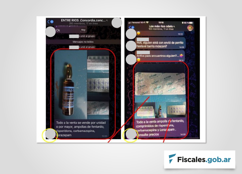 En los mismos grupos publicaba fotos de las ampollas del opioide y de otras drogas con el mensaje: “Todo a la venta. Se vende por unidad o por mayor. Ampolla de fentanilo, comprimidos de risperidona, carbamazepina y lorazepam. Consulte precios”.