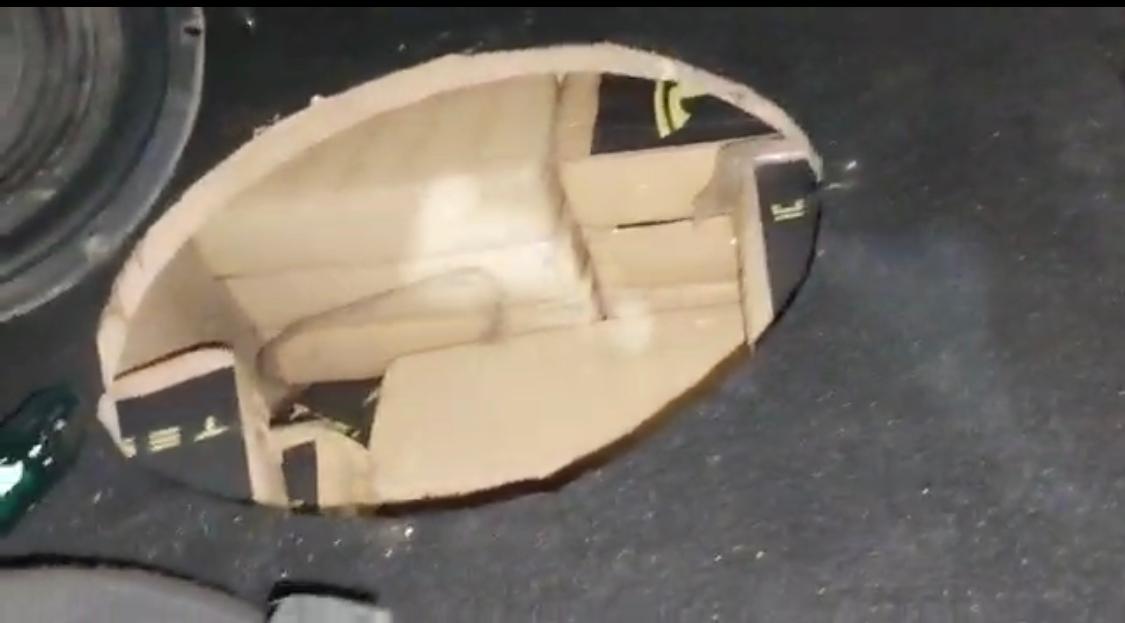 Como consecuencia del control físico del automóvil, la Gendarmería advirtió un equipo de sonido con un bafle de grandes dimensiones colocado en el baúl, el cual presentaba señas de haber sido acondicionado recientemente, lo que despertó las sospechas de los miembros de la fuerza de seguridad.
