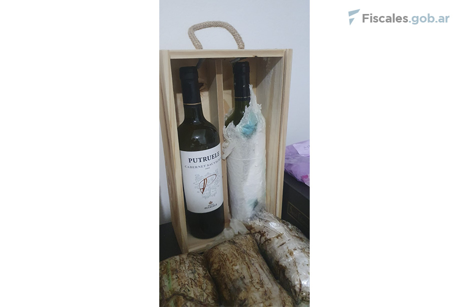 Dos de las botellas de vino secuestradas con cocaína líquida. Foto: Prefectura Naval