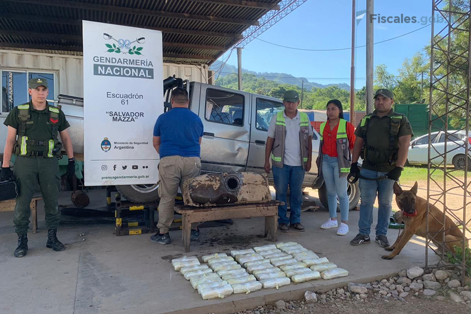 Posteriormente, en la base operativa de Aguaray, los gendarmes desarmaron el tanque, de donde se extrajeron 44 paquetes equivalentes a 24 kilos y 895 gramos de cocaína, con lo cual se procedió a la detención de Lazarte y de su hijo.