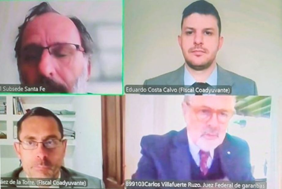 Los fiscales coadyuvantes Eduardo Costa Calvo e Ignacio Páez de la Torre y el juez Carlos Villafuerte Ruzo, durante la audiencia de formalización vía Zoom. Foto: Unidad Fiscal Santa Fe