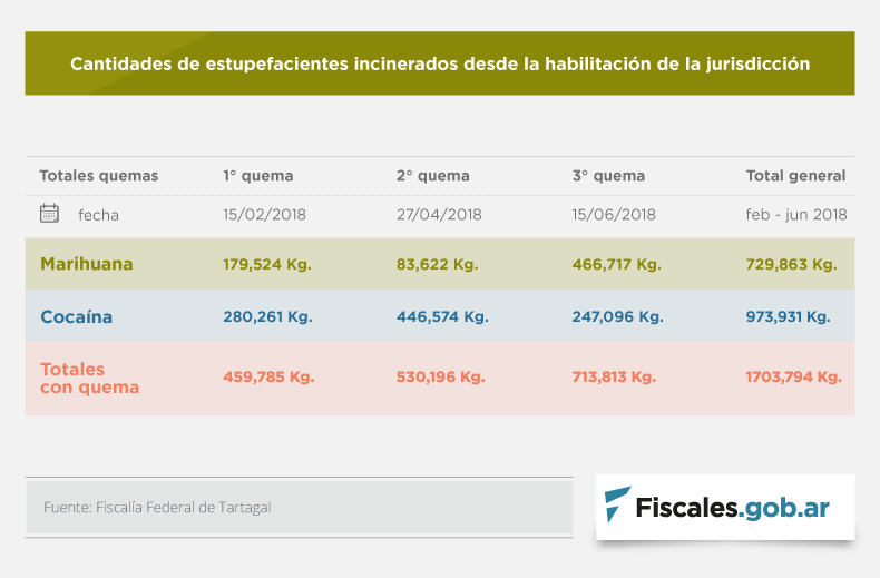 Desde la habilitación de la justicia federal en la ciudad de Tartagal, y a ocho meses de su funcionamiento, ya se secuestraron y destruyeron, en tres quemas, más de 1.700 kilos de droga, de los cuales 970 fueron cocaína, proveniente de Bolivia, y 730 marihuana, proveniente de Paraguay.