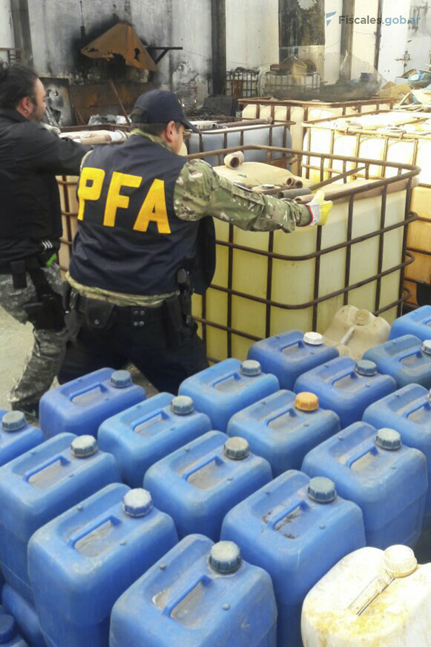 En función de ello, la Fiscalía requirió al juez instructor nuevos allanamientos en la localidad de José C. Paz y en la Ciudad Autónoma de Buenos Aires. Además de producirse el secuestro provisorio de unos 50 automóviles en dos locales, los investigadores dieron con un galpón que funcionaba en José C. Paz con la fachada de una empresa química, sin inscripción en ninguno de los registros de los organismos estatales de control. Allí, hallaron 3.240 litros de ácido clorhídrico, 30 kilogramos de soda cáustica y una cantidad aún no determinada de ácido sulfúrico en decenas de bidones. Todas esas sustancias son precursores químicos.