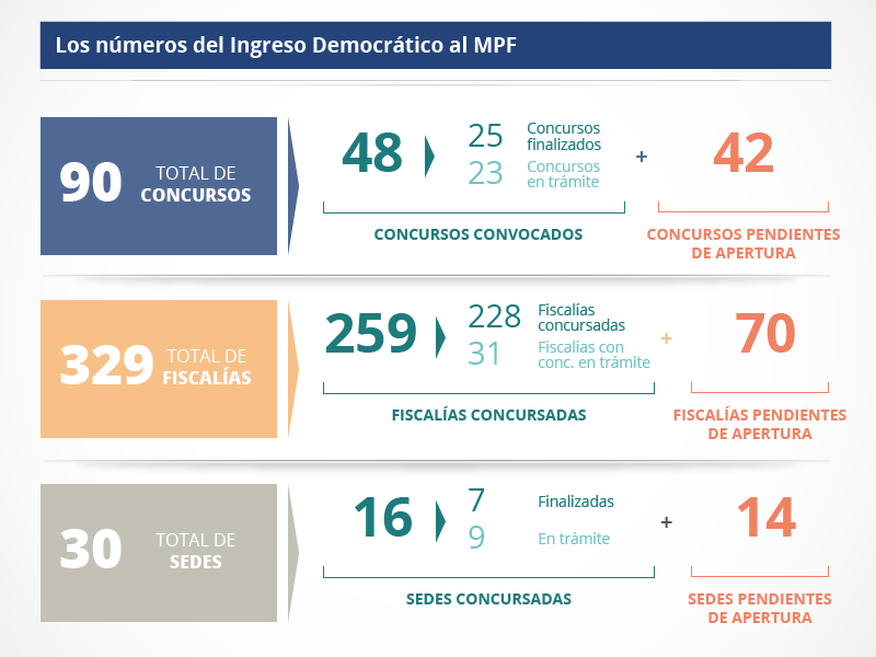 Tras la sanción de la ley de Ingreso democrático e igualitario de personal al Poder Judicial de la Nación y al Ministerio Público de la Nación (Ley 26.861) en marzo de 2014, la Procuración General de la Nación reglamentó el sistema por concurso público y abierto al MPF y estableció un cronograma de dos años para la realización de concursos en 30 sedes del país (Resoluciones PGN 507/14 y PGN 508/14).