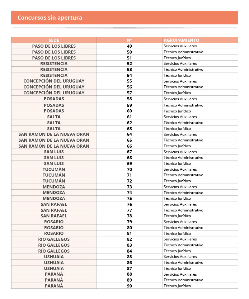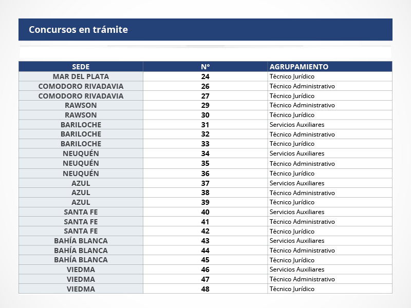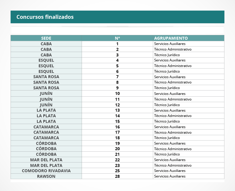 Los concursos se sustanciaron en las ciudades de Buenos Aires, Esquel, Santa Rosa, Junín, La Plata, Catamarca, Córdoba, Mar del Plata, Comodoro Rivadavia, Rawson, Bariloche, Neuquén y Azul. Para el 2016 se proyecta realizarlos en otras 18 sedes.