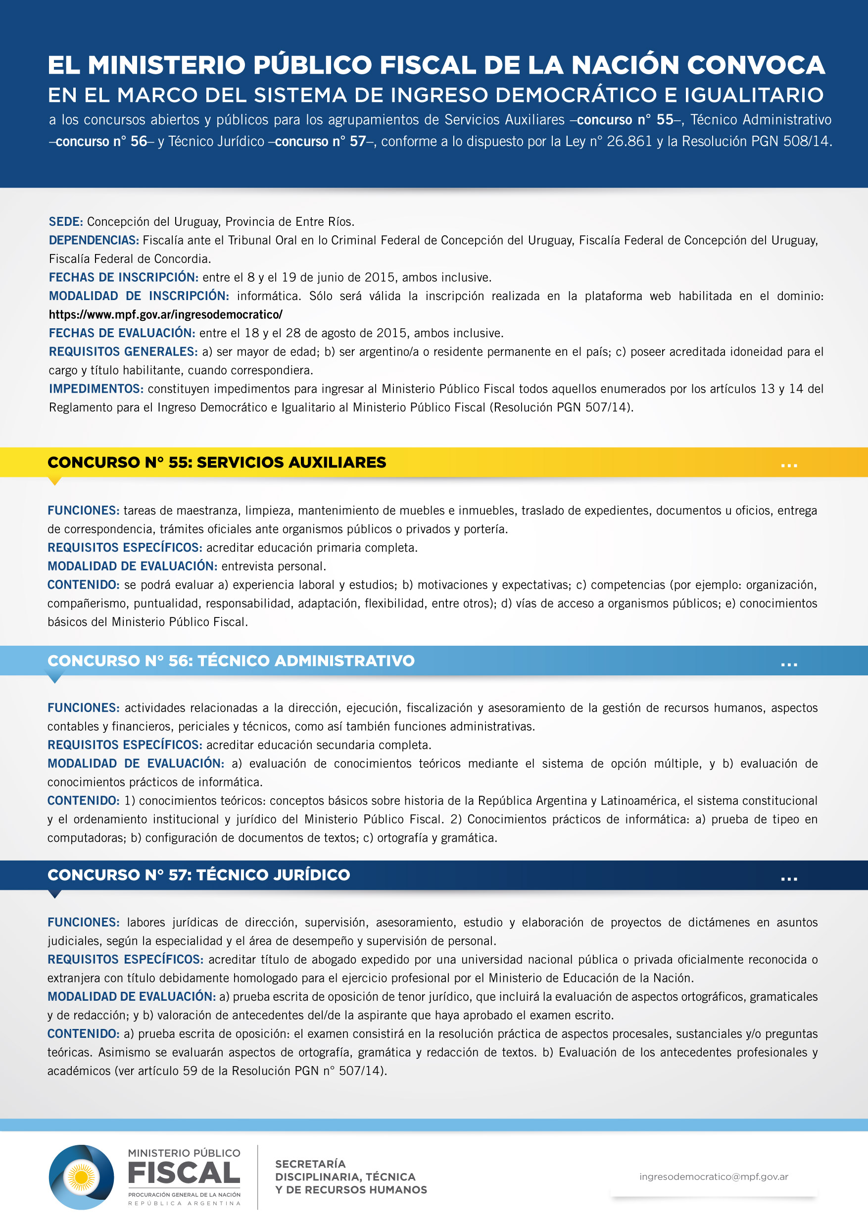 A través de la resolución ING 1569/2015, la titular del MPF llamó a los concursos N° 55 (Servicios Auxiliares), N° 56 (Técnico Administrativo) y N°57 (Técnico Jurídico). El período de inscripción se extenderá desde el 8 al 19 de junio de 2015, ambos días inclusive, y debe realizarse a través de la página web https://www.mpf.gov.ar/ingresodemocratico/. Por su parte, la evaluación de los postulantes tendrá lugar entre el 18 y el 28 de agosto, también inclusive.