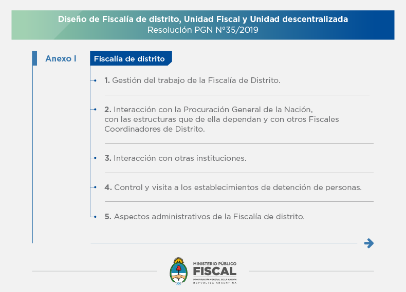 Así, la actuación del organismo estará a cargo de una Fiscalía de Distrito que, entre otras cosas, coordinará y organizará las Unidades Fiscales, conformará equipos temporales para investigaciones genéricas o complejas, se encargará de la distribución administrativa de casos entre las unidades fiscales y sus sedes descentralizadas y designará un fiscal revisor. Además, interactuará con la Procuración General de la Nación, sus estructuras dependientes, otras Fiscalías de Distrito y otras instituciones, además de controlar y visitar los establecimientos de detención, entre otras funciones.
