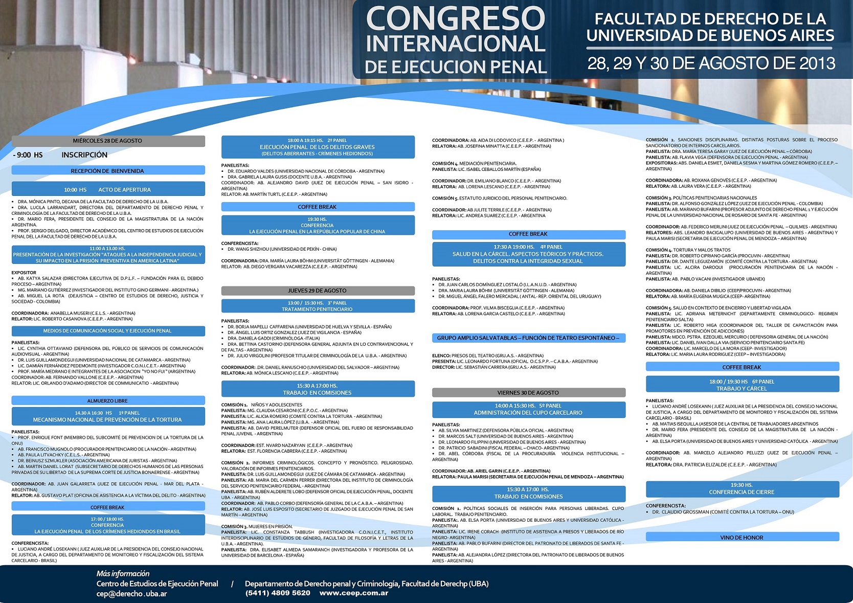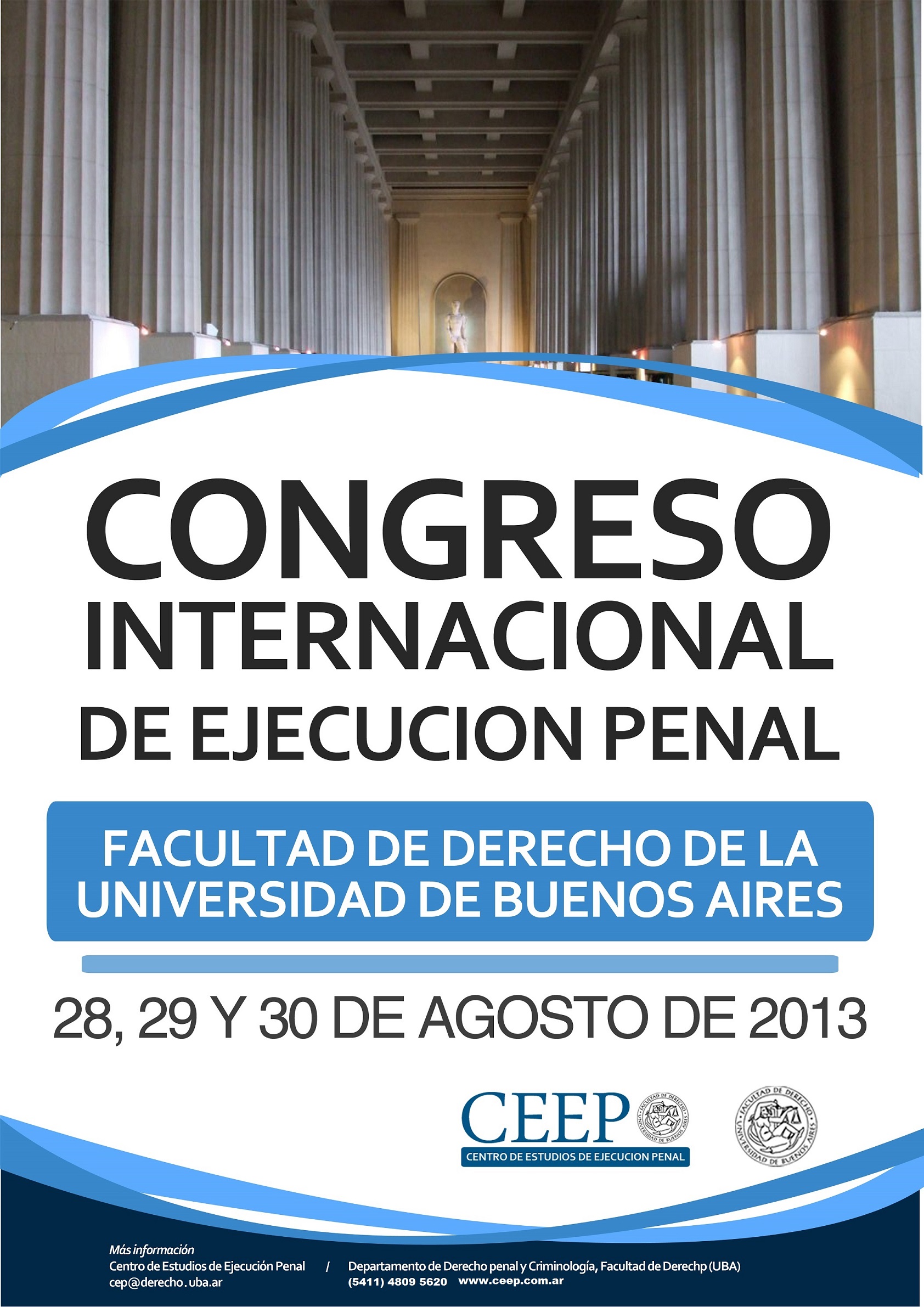 Los días 28, 29 y 30 de agosto se llevará adelante en la Facultad de Derecho de la Universidad de Buenos Aires el Congreso Internacional de Ejecución Penal. El mismo es organizado conjuntamente por el Centro de Estudios de Ejecución Penal de la UBA, la Facultad de Derecho, los Ministerios Públicos de la Defensa y Fiscales de la Nación y de la Ciudad de Buenos Aires, entre otras organizaciones e Instituciones públicas.