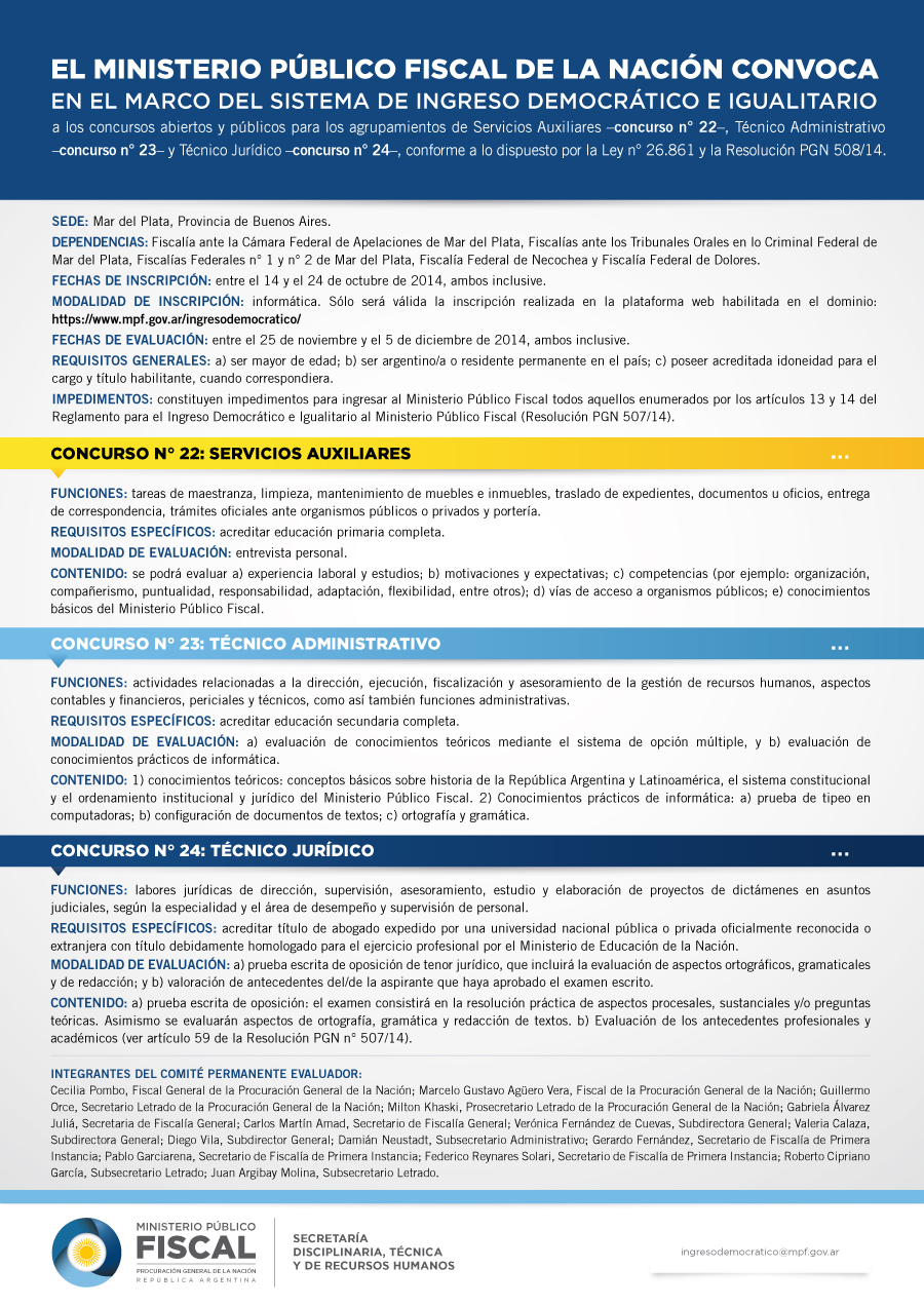 La inscripción estará abierta entre el 29 de septiembre y el 10 de octubre y debe realizarse a través de https://www.mpf.gob.ar/Ingresodemocratico/. La fecha de evaluación de los postulantes, por su parte, será del 10 al 21 noviembre.