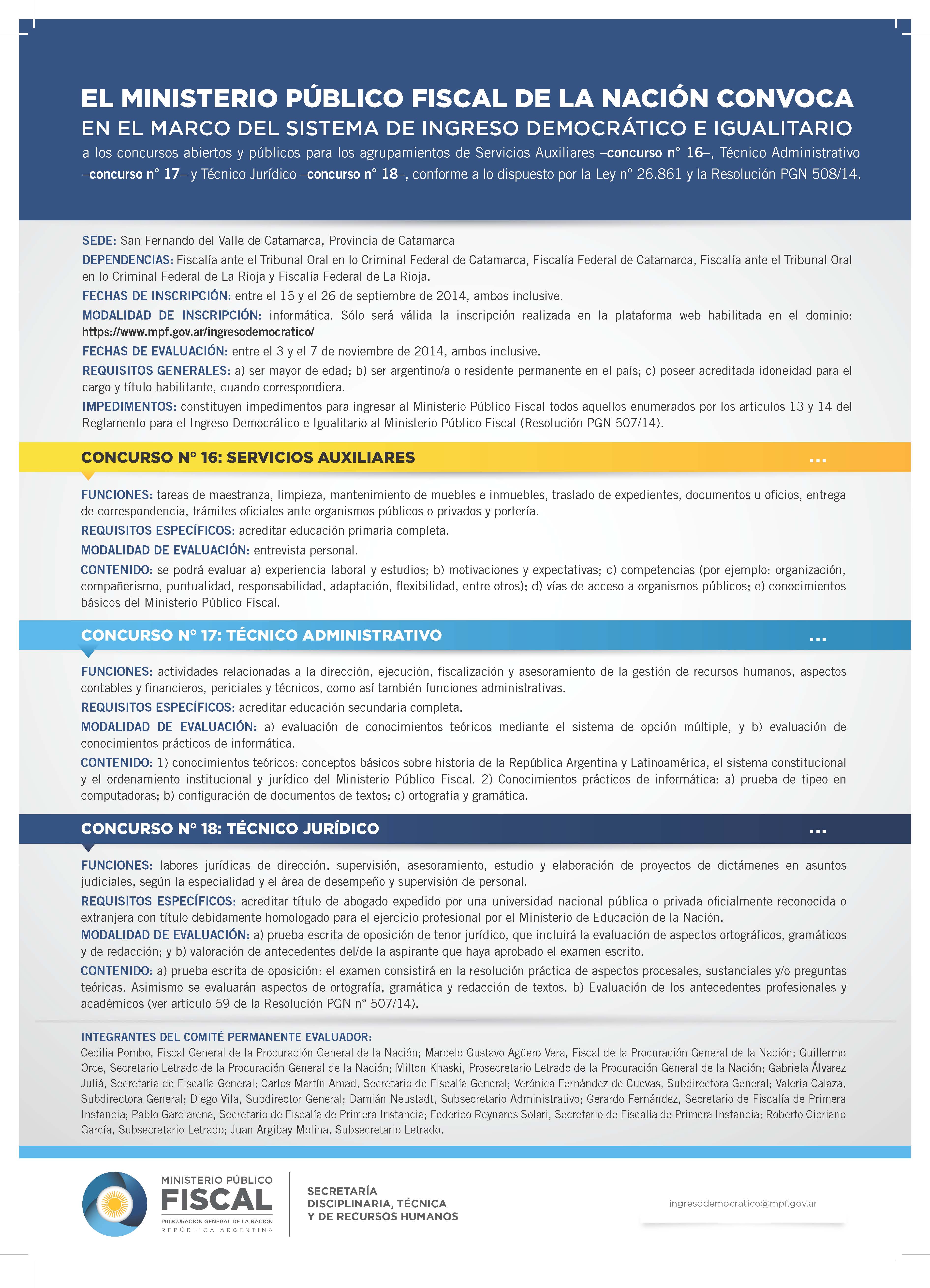 La procuradora General de la Nación, Alejandra Gils Carbó, convocó al concurso público y abierto N° 16 para el agrupamiento "Servicios Auxiliares”; al N°17 para “Técnico Administrativo”, y al N°18, para “Técnico Jurídico”. El objetivo es cubrir las vacantes que se generen en las fiscalías federales de instrucción y ante tribunales orales de Catamarca y La Rioja.