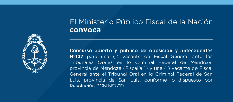 El procurador general de la Nación interino, Eduardo Ezequiel Casal, oficializó mediante Resolución PGN N°7/2019 –y conforme lo dispuesto por la Ley N°27.148 Orgánica del Ministerio Público Fiscal y el Reglamento para la Selección de Magistradas/os del Ministerio Público Fiscal de la Nación (Resolución PGN N°1457/2017 y rectificada por Resoluciones PGN N°1962/2017 y PGN N°19/2018)- la convocatoria al concurso abierto y público de oposición y antecedentes N°127 para proveer una (1) vacante de Fiscal General ante los Tribunales Orales en lo Criminal Federal de Mendoza, provincia de Mendoza (Fiscalía 1) y una (1) vacante de Fiscal General ante el Tribunal Oral en lo Criminal Federal de San Luis, provincia de San Luis.