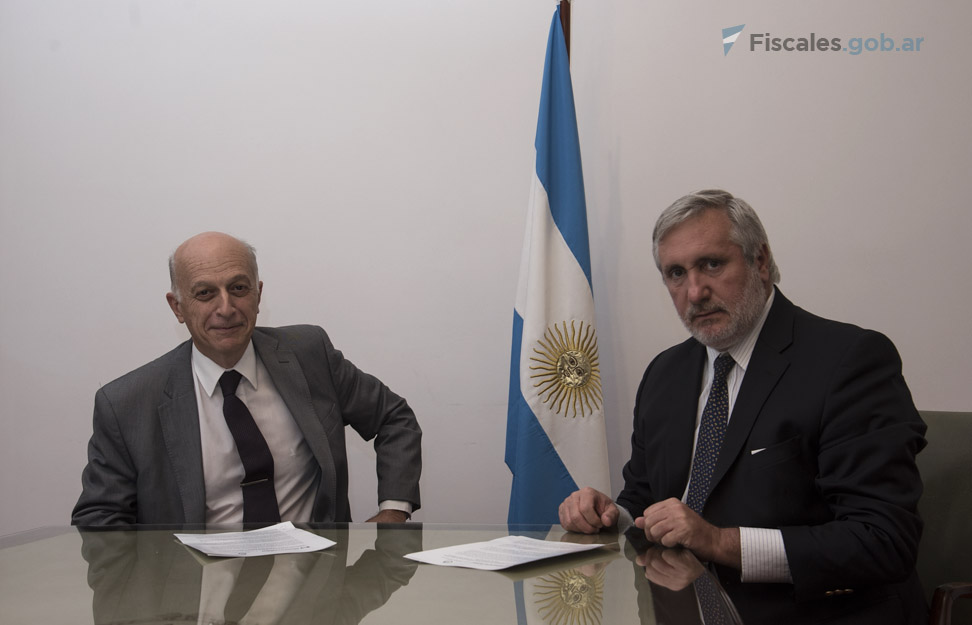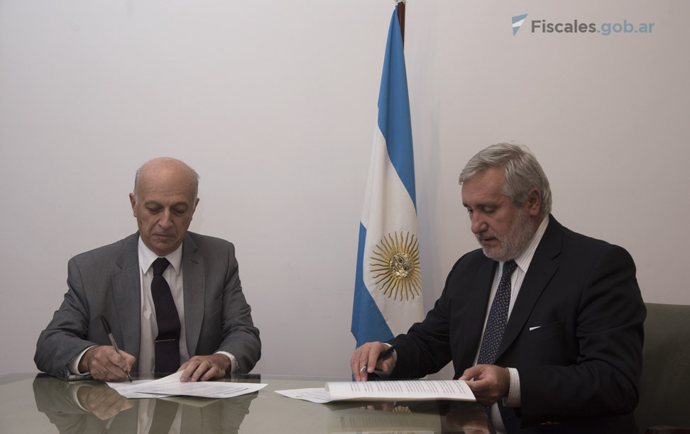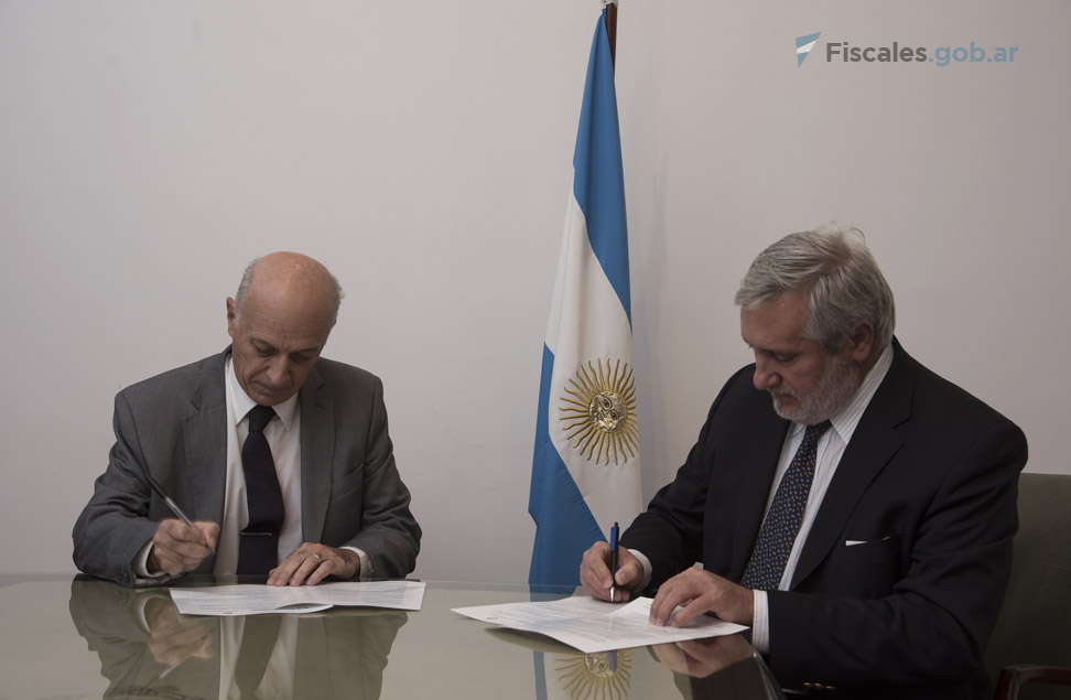 El procurador general de la Nación interino, Eduardo Casal, suscribió un convenio de cooperación con el procurador general de la Suprema Corte de Justicia de la Provincia de Buenos Aires, Julio Conte Grand, durante un acto que tuvo lugar esta tarde en el edificio central de la Procuración General de la Nación, ubicado en la calle Tte. Gral. Perón 667. El documento suscripto por ambos funcionarios establece el compromiso institucional por parte del Ministerio Público bonaerense de brindar asistencia técnica para una futura implementación a nivel federal del Sistema de Identificación Biométrica (IBIO), herramienta desarrollada por la subsecretaría de Informática de ese organismo.