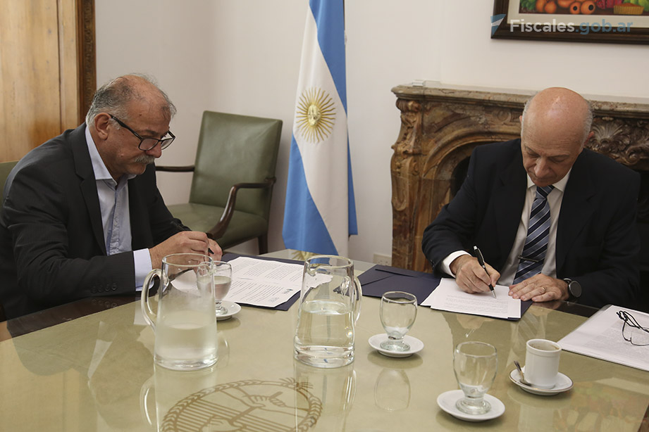 El procurador general de la Nación interino, Eduardo Casal, suscribió junto al titular de la Administración Nacional de Medicamentos, Alimentos y Tecnología Médica (ANMAT), Carlos Alberto Chiale, un convenio marco de cooperación técnica entre ambos organismos. La firma del documento tuvo lugar este mediodía en el Salón de los Cuadros de la Procuración General de la Nación, en la calle Tte. Gral. Perón 667, en el microcentro porteño.