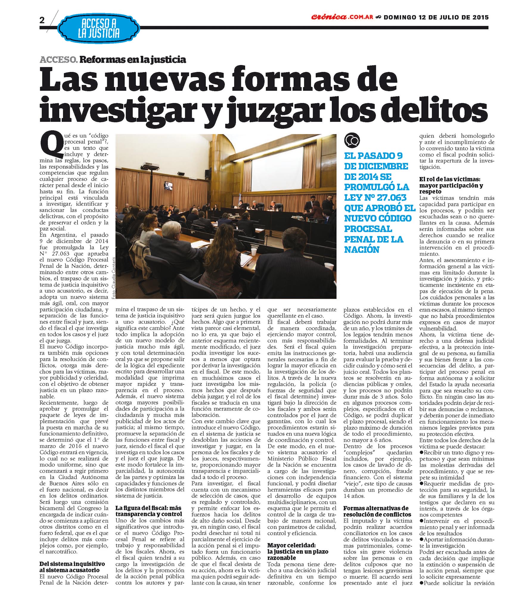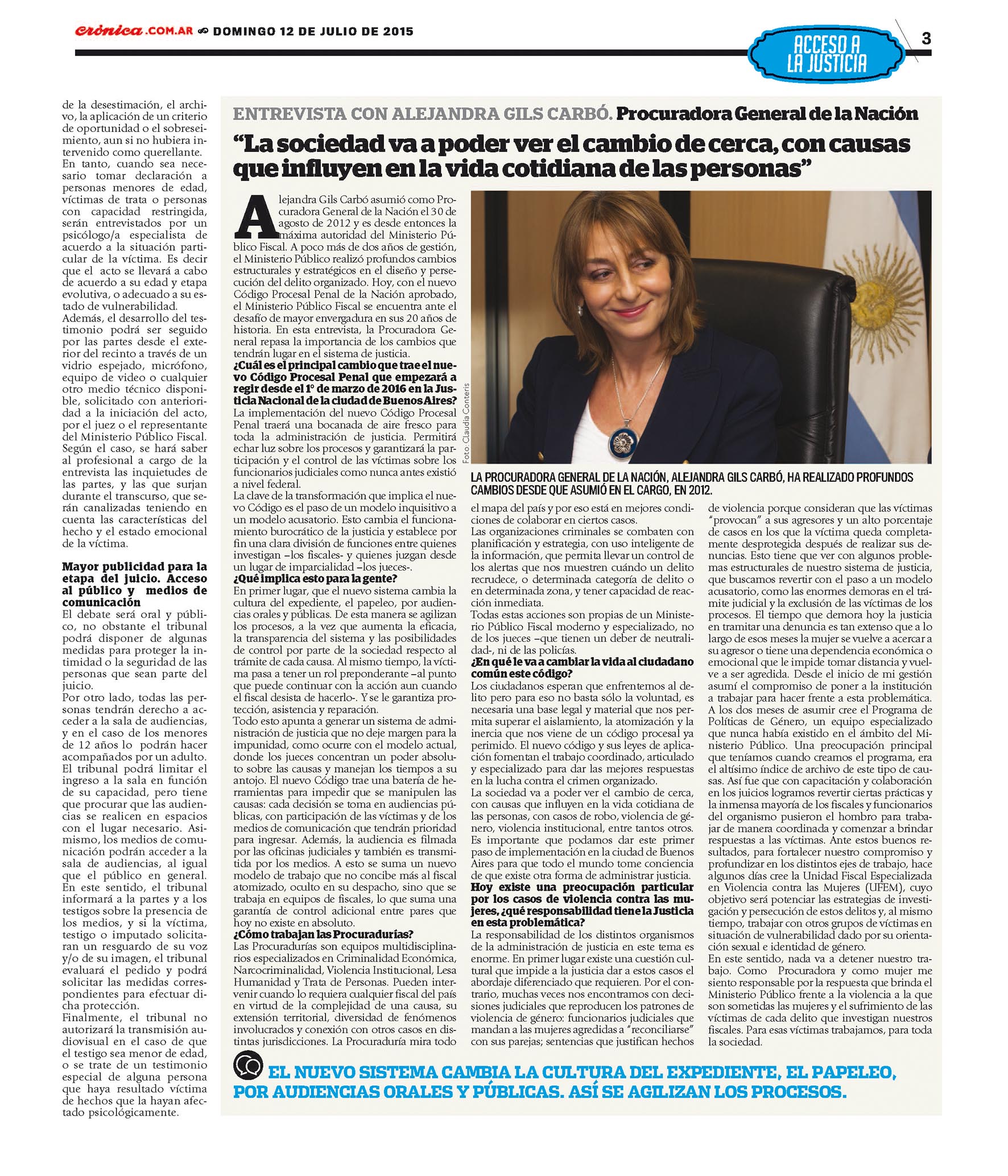 En este número, la procuradora general de la Nación, Alejandra Gils Carbó, analiza "la bocanada de aire fresco" para todo el sistema de justicia que implica la puesta en funcionamiento del nuevo CPP. "En primer lugar, que el nuevo sistema cambia la cultura del expediente, elpapeleo, por audiencias orales y públicas. De esta manera se agilizan los procesos, a la vez que aumenta la eficacia, la transparencia del sistema y las posibilidadesde control por parte de la sociedad respecto al trámite de cada causa. Al mismo tiempo, la víctima pasa a tener un rol preponderante –al punto que puede continuar con la acción aun cuando el fiscal desista de hacerlo-. Y se le garantiza protección, asistencia y reparación", consideró la titular del Ministerio Público Fiscal.
