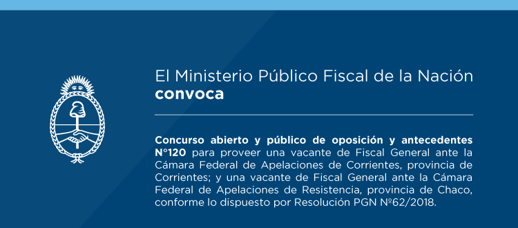 El procurador general de la Nación interino, Eduardo Ezequiel Casal, oficializó mediante Resolución PGN N°62/2018 –y conforme lo dispuesto por la Ley N°27.148 Orgánica del Ministerio Público Fiscal y el Reglamento para la Selección de Magistradas/os del Ministerio Público Fiscal de la Nación (Resolución PGN N°1457/2017 y rectificada por Resoluciones PGN N°1962/2017 y PGN N°19/2018)- la convocatoria al concurso abierto y público de oposición y antecedentes N°120 para proveer una (1) vacante de Fiscal General ante la Cámara Federal de Apelaciones de Corrientes, provincia homónima, y una (1) vacante de Fiscal General ante la Cámara Federal de Apelaciones de Resistencia, provincia de Chaco.