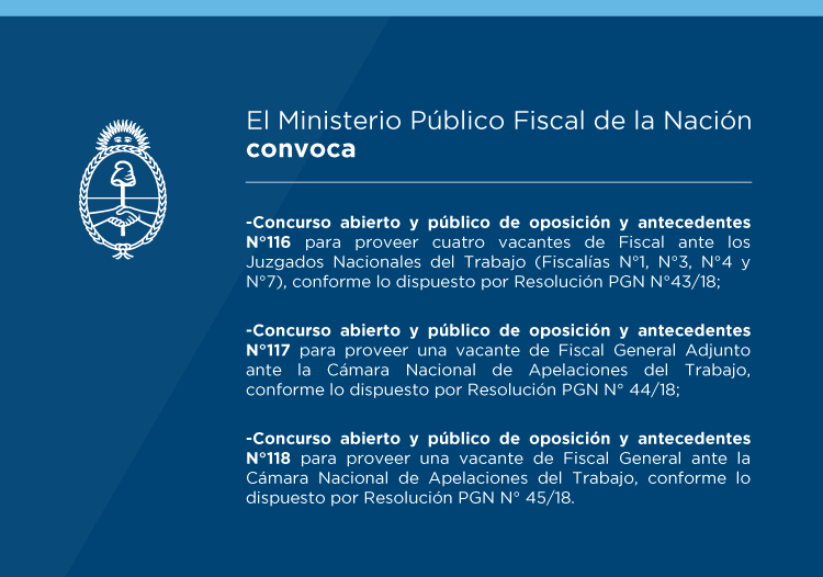 El procurador general de la Nación interino, Eduardo Ezequiel Casal, oficializó mediante Resoluciones PGN N°43/2018, PGN N°44/2018 y PGN N°45/2018 –y conforme lo dispuesto por la Ley N°27.148 Orgánica del Ministerio Público Fiscal y el Reglamento para la Selección de Magistradas/os del Ministerio Público Fiscal de la Nación (Resolución PGN N°1457/2017 y rectificada por Resoluciones PGN N°1962/2017 y PGN N°19/2018)- las convocatoria para los concursos abiertos y públicos para cubrir distintas vacantes en el Fuero Nacional del Trabajo.