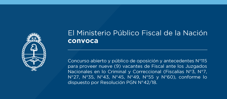 El procurador general de la Nación interino, Eduardo Ezequiel Casal, oficializó mediante Resolución PGN N°42/2018 –y conforme lo dispuesto por la Ley N°27.148 Orgánica del Ministerio Público Fiscal y el Reglamento para la Selección de Magistradas/os del Ministerio Público Fiscal de la Nación (Resolución PGN N°1457/2017 y rectificada por Resoluciones PGN N°1962/2017 y PGN N°19/2018)- la convocatoria al concurso abierto y público de oposición y antecedentes N°115 para proveer nueve vacantes de Fiscal ante los Juzgados Nacionales en lo Criminal y Correccional (Fiscalías N°3, N°7, N°27, N°35, N°43, N°45, N°49, N°55 y N°60).