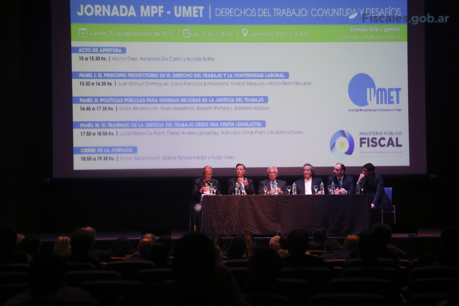 El primer panel tuvo como eje “el principio protectorio en el derecho del trabajo y la continuidad laboral” y contó con el titular de la Fiscalía Nacional del Trabajo N°5, Juan Manuel Domínguez; el diputado nacional Héctor Recalde; el secretario general del Sindicato de Canillitas, Omar Plaini, y los abogados laboralistas Horacio Meguira y Francisco Echezarreta.