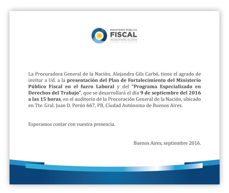 El próximo viernes a partir de las 15:00, la procuradora general de la Nación, Alejandra Gils Carbó, presentará el Plan de Fortalecimiento del Ministerio Público Fiscal en el fuero laboral y el “Programa Especializado en Derecho del Trabajo". La cita será en el salón auditorio de la PGN, Tte. Gral. Juan Domingo Perón, 667, Planta Baja, de la Ciudad Autónoma de Buenos Aires.