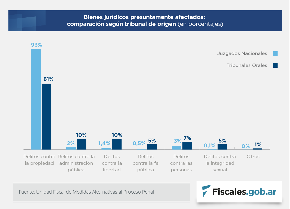 Los delitos contra la propiedad constituyen la amplia mayoría de las suspensiones de juicio a prueba, aunque su incidencia en términos proporcionales varía según cuál sea su tribunal de origen. Con 982 casos, son el 93% de los acuerdos en los juzgados nacionales y con 2.412, el 61% en los TOC.