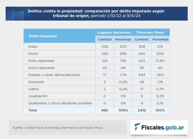 La Unidad Fiscal de Medidas Alternativas al Proceso Penal (UFIMAPP), a cargo de la fiscal general María Ángeles Ramos, presentó un informe sobre la situación de los 4.196 legajos de suspensión de juicio a prueba (SJP) notificados entre el 1° de octubre de 2022 y el 9 de junio de 2024, en el que se destaca que el plazo de 12 meses aparece como el más aplicado y que los delitos contra la propiedad encabezan por amplia mayoría las causas resueltas por esta vía, ya que reúnen el 93% de los casos acordados en juzgados nacionales y el 61% en tribunales orales.