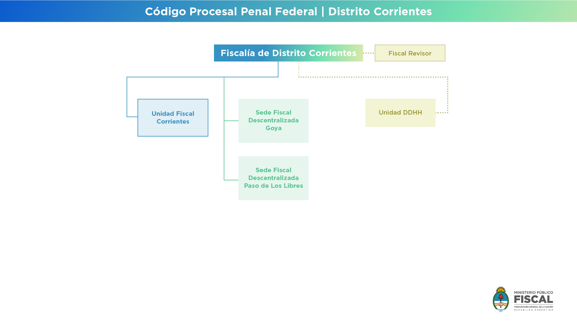 La Fiscalía de Distrito de Corrientes estará compuesta por la Unidad Fiscal Corrientes -con jurisdicción en los departamentos de Corrientes Capital, Berón de Astrada, Concepción, Empedrado, General Paz, Itatí, Ituzaingó, Mburucuyá, Saladas, San Cosme, San Luis del Palmar y San Miguel- y dos Sedes Fiscales Descentralizadas: la de Goya -abarca los departamentos de Bella Vista, Esquina, Goya, Lavalle y San Roque-, y la de Paso de los Libres -comprende a los departamentos de Curuzú Cuatiá, General Alvear, Mercedes, Monte Caseros, Paso de los Libres, San Martín, Santo Tomé y Sauce-.