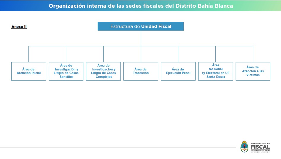 La nueva estructura del MPF de la Nación en la jurisdicción tendrá una unidad fiscal en Bahía Blanca, con intervención sobre once municipios del sur de la provincia de Buenos Aires, y otra en Santa Rosa, para toda la provincia de La Pampa. El fiscal general Horacio Azzolin fue designado transitoriamente como fiscal con funciones de coordinación.