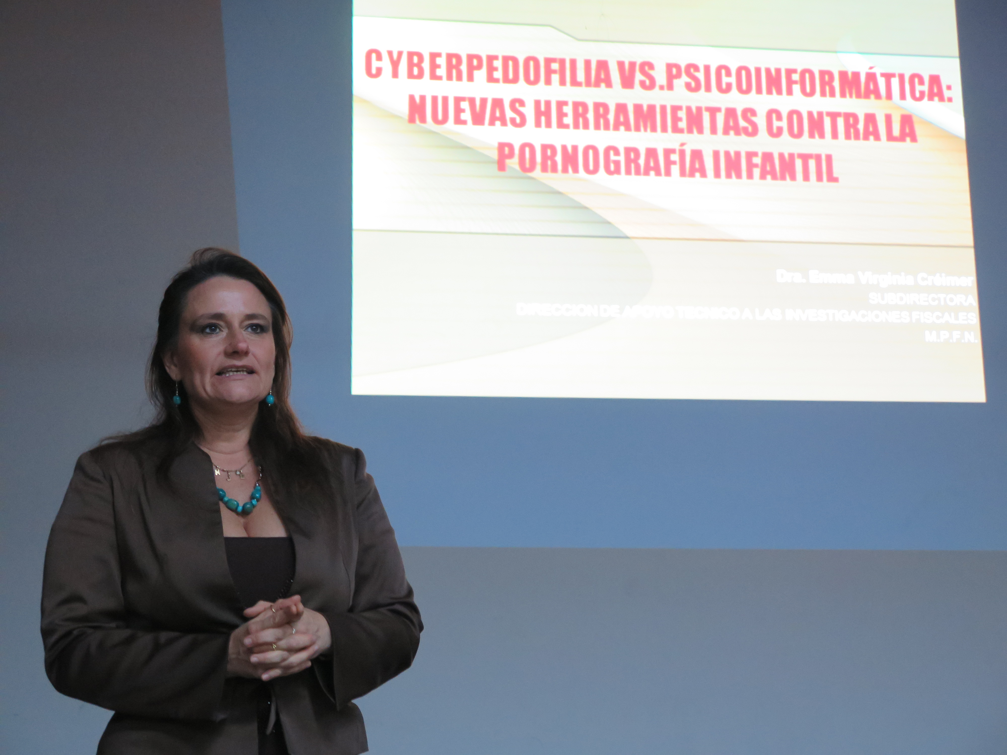 La médica forense y subdirectora de la Dirección de Apoyo Técnico a las Investigaciones Fiscales (DATIF) de la Procuración General de la Nación, Virginia Creimer, participó de una jornada sobre Violencia Familiar que organizó la Facultad de Ciencias de la Salud y Servicio Social de la Universidad Nacional de Mar del Plata. “¿Cuál es tu punto de goce?”, interrogaba la primera diapositiva de la presentación realizada por Creimer a más de un centenar de personas presentes, titulada “Cyberpedofilia vs. Psicoinformática: nuevas herramientas contra la pornografía infantil”.