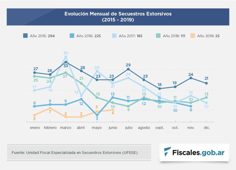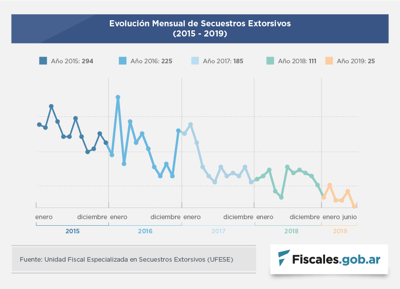 El balance analiza la información recopilada en 432 hechos de secuestro extorsivo, ocurridos a lo largo del país entre junio de 2016 y junio de 2019: fueron 225 en 2016, 185 en 2017, 111 en 2018 y 25 hasta junio de este año. Si se tiene en cuenta también 2015 -año para el que se registraron 294 episodios-, puede observarse una disminución de las cifras sostenida hasta la actualidad.