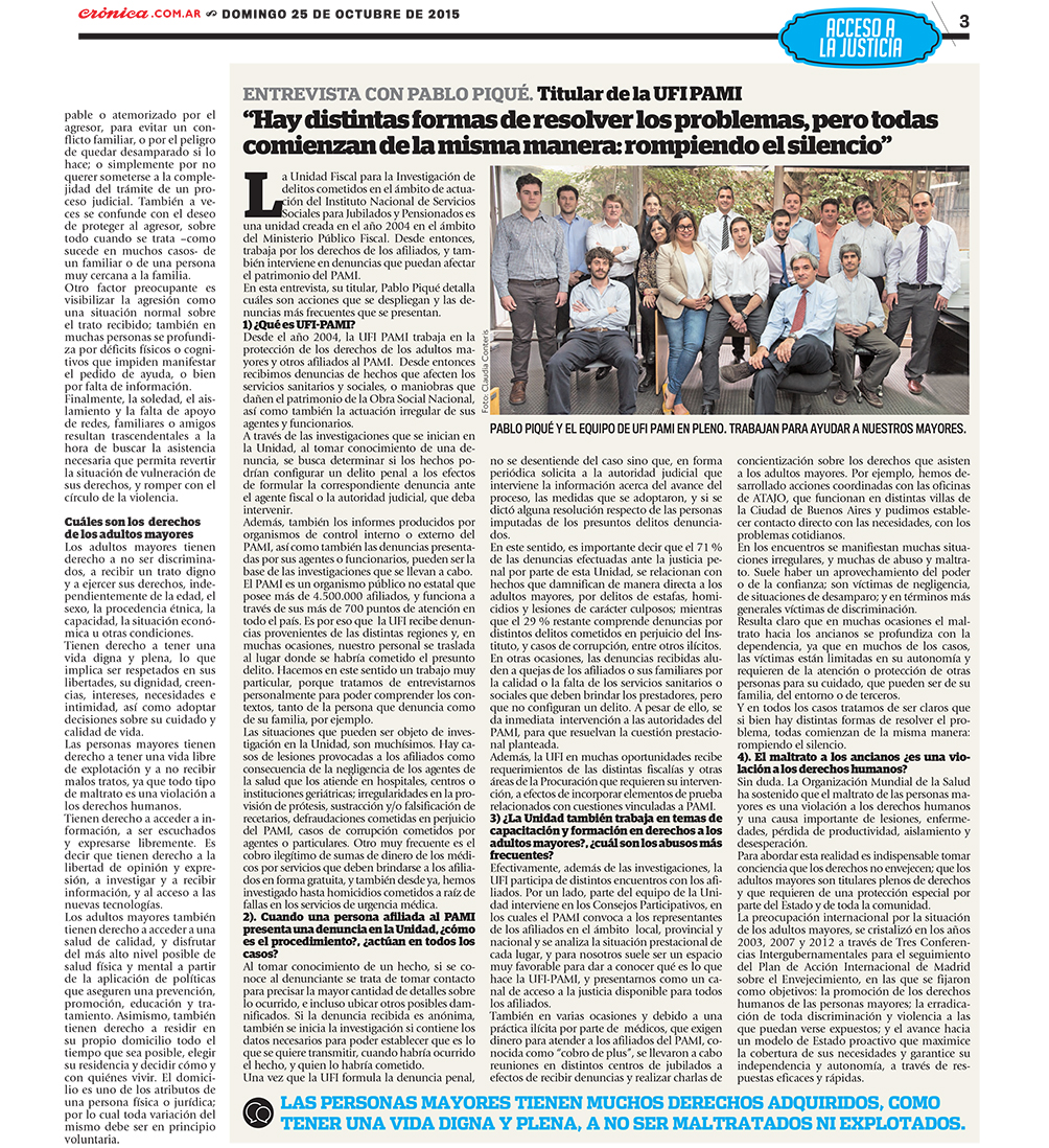 Entre sus páginas, los lectores encontraron un artículo que analiza los desafíos actuales para lograr una sociedad que defienda y ampare a las personas de edad y las incluya y reconozca como socias indispensables para el desarrollo social, como así también los parámetros para reconocer el maltrato -ya sea físico-psicológico, patrimonial o institucional-; una entrevista a Pablo Piqué, el titular de la Unidad Fiscal para la Investigación de delitos cometidos en el ámbito de actuación del Instituto Nacional de Servicios Sociales para Jubilados y Pensionados (UFI PAMI), en la que detalla cuáles son las acciones que despliega junto a su equipo y las denuncias más frecuentes que se presentan en la dependencia creada en 2004; además, una nota que cuenta el caso de Luis, un afiliado del PAMI que pudo realizarse una operación tras la intervención del Ministerio Público Fiscal.
