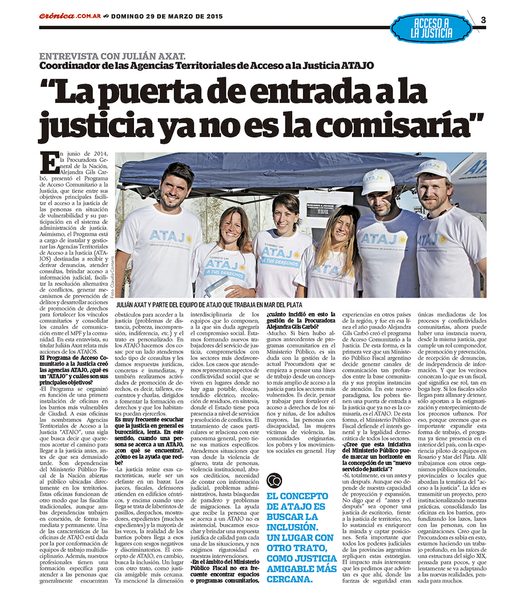 Esta séptima edición incluyó una entrevista con el coordinador de las Agencias Territoriales de Acceso a la Justicia, Julián Axat, quien subrayó que los ATAJOs representan "un antes y un después" en el acceso al servicio de justicia. "La justicia tiene las características que siempre se marcan: burocrática y lenta. Suele ser un elefante en un bazar. Los jueces, fiscales, defensores atienden en edificios céntricos, y encima cuando uno llega se trata de laberintos de pasillos, despachos, mostradores, expedientes muchos expedientes) y la mayoría de las veces, la realidad de los barrios pobres llega a esos lugares con sesgos negativos y discriminatorios. El concepto de ATAJO, en cambio, busca la inclusión", explicó.