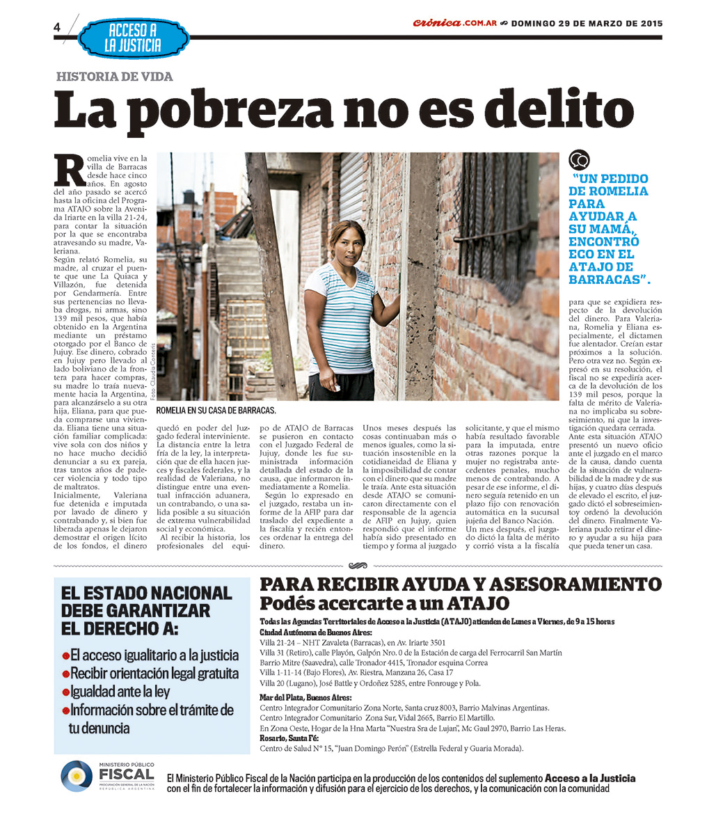 Además, "Acceso a la Justicia" presentó la historia de Romelia, quien vive hace cinco años en la villa de Barracas. En agosto, se acercó a uno de los ATAJOS a denunciar que la Gendarmería había detenido a su madre en La Quiaca, quien llevaba dinero que había conseguido a través de un crédito otorgado por el Banco de Jujuy para hacer compras del lado boliviano de la frontera. El juez la imputó por lavado de dinero y contrabando y le incautó los fondos.
