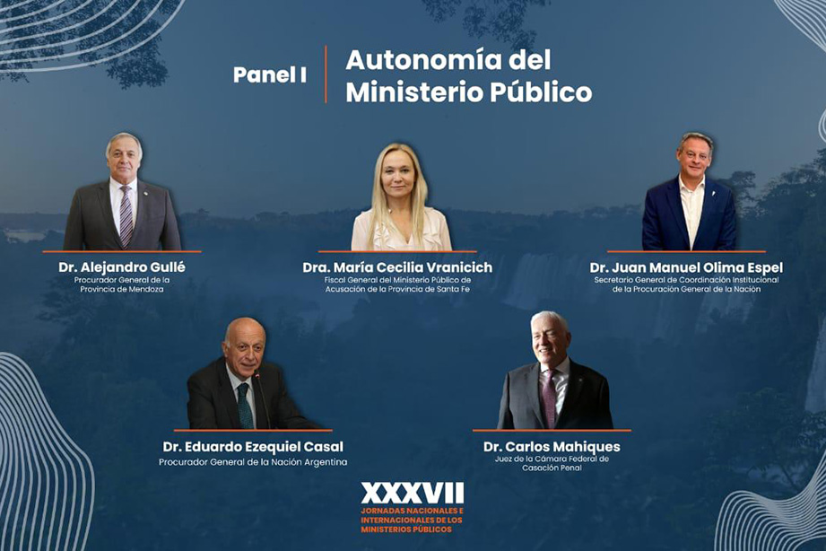 Posteriormente, tuvo lugar el primer panel, en el que el procurador Casal, el secretario Olima Espel, el procurador general del Ministerio Público Fiscal de la provincia de Mendoza, Alejandro Gullé, y la fiscal general del Ministerio Público de la Acusación (MPA) de la provincia de Santa Fe, María Cecilia Vranicich, disertaron sobre la “Autonomía del Ministerio Público”.
