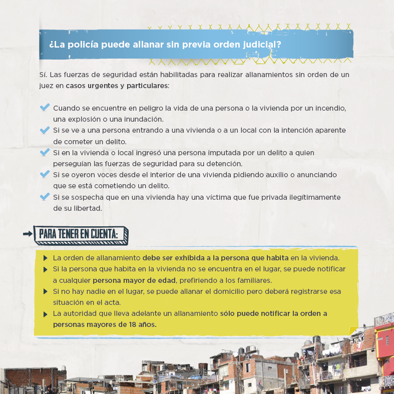 También, destaca las situaciones excepcionales en las cuales la policía u otra fuerza de seguridad puede realizar este tipo de procedimiento sin orden judicial, como en los casos en que peligre la vida de una persona, o si se sospecha que dentro de una vivienda hay una víctima privada de su libertad. Se destaca que este tipo de actuaciones sólo pueden notificarse a personas mayores de 18 años y que los allanamientos masivos (conocidos como razzias) en barrios son ilegales.