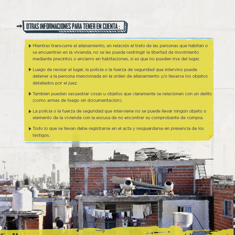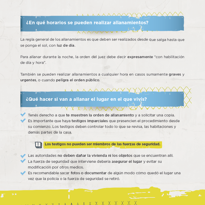 El material incluye especificaciones sobre los derechos de las personas ante estas situaciones, en las que deben recibir una copia de la orden de allanamiento y contar con testigos imparciales que participen durante todo el procedimiento desde su inicio. No se debe dañar la vivienda ni los objetos personales que allí se encuentran, por lo que es recomendable tomar fotografías o documentar cómo quedó el lugar una vez retiradas las fuerzas de seguridad que intervinieron.