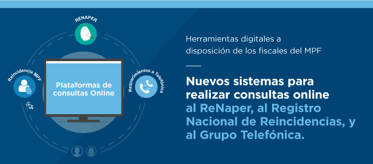 Los fiscales del Público Fiscal de la Nación ya tienen a disposición los sistemas para realizar consultas online a las bases de datos del Registro Nacional de las Personas (ReNaPer), del Registro Nacional de Reincidencias (RNR) y de las empresas de telecomunicaciones del Grupo Telefónica –Telefónica de Argentina y Movistar-.