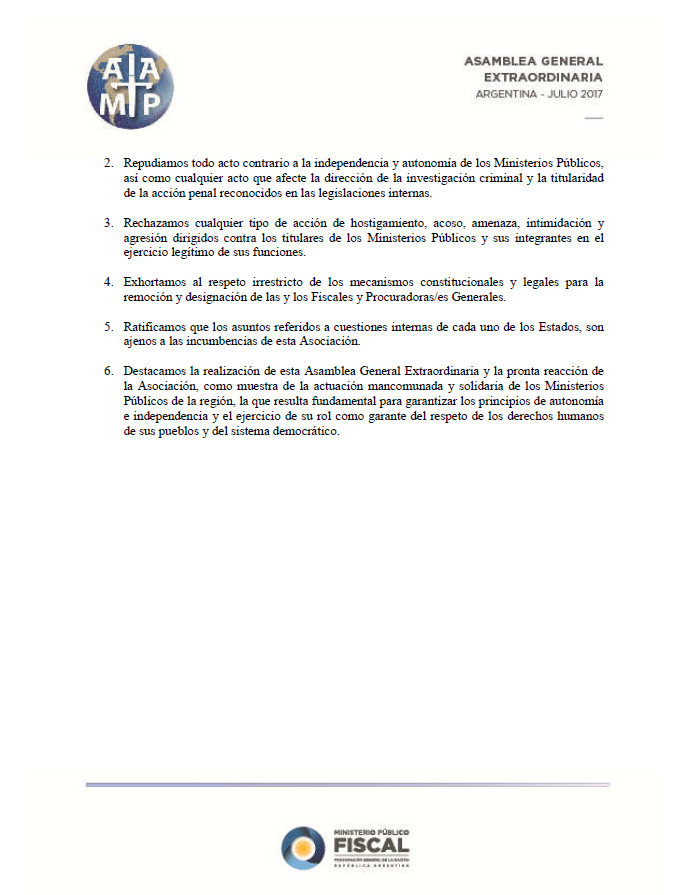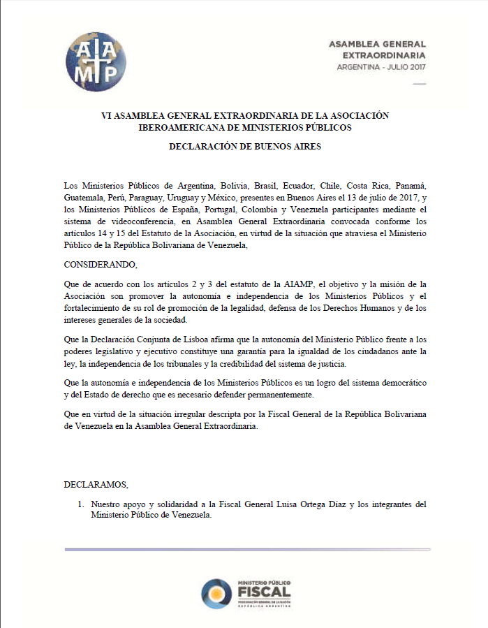 Los Ministerios Públicos de Argentina, Bolivia, Brasil, Ecuador, Chile, Costa Rica, Panamá, Guatemala, Perú, Paraguay, Uruguay y México, presentes en Buenos Aires el 13 de julio de 2017, y los Ministerios Públicos de España, Portugal, Colombia y Venezuela participantes mediante el sistema de videoconferencia, en Asamblea General Extraordinaria convocada conforme los artículos 14 y 15 del Estatuto de la Asociación, en virtud de la situación que atraviesa el Ministerio Público de la República Bolivariana de Venezuela,