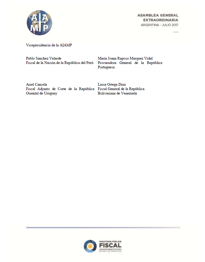 La declaración final fue firmada por el fiscal general del Estado Plurinacional de Bolivia y presidente de la AIAMP, Ramiro José Guerrero Peñaranda; la procuradora general de la República de Panamá y vicepresidenta de la AIAMP, Kenia Porcell Díaz; el fiscal general de la República de Costa Rica y secretario general de la AIAMP, Jorge Chavarría Guzmán; la procuradora general de la Nación y anfitriona de la Asamblea Extraordinaria, Alejandra Gils Carbó; el vice fiscal general de la República Federativa de Brasil, Jose Bonifacio Borges de Andrada; el fiscal nacional de la República de Chile, Jorge Abbott Charme; el vice fiscal general de la República de Colombia, María Paulina Riveros Dueñas; el fiscal general del Estado de la República de Ecuador, Carlos Baca Mancheno; el fiscal general del Reino de España, José Manuel Maza; el fiscal general de la República de Guatemala, Thelma Esperanza Aldana Hernández; el subprocurador jurídico y de asuntos internacionales de los Estados Unidos Mexicanos, Alberto Elías Beltran; el fiscal de la nación de la República del Perú, Pablo Sanchez Velarde; el fiscal general del Estado de la República de Paraguay, Javier Díaz Verón; la procuradora general de la República Portuguesa, María Joana Raposo Marquez Vidal; el fiscal adjunto de Corte de la República Oriental de Uruguay, Ariel Cancela, y la fiscal general de la República Bolivariana de Venezuela, Luisa Ortega Diaz.