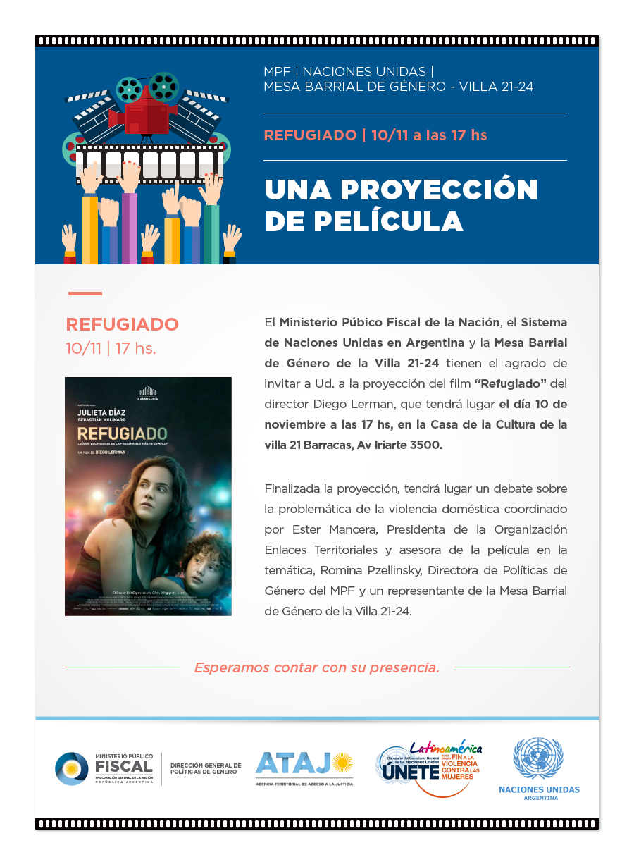 La película del director argentino Diego Lerman será exhibida en Avenida Iriarte 3500. Convocan el Ministerio Público Fiscal de la Nación, el Sistema de Naciones Unidas en Argentina y la Mesa Barrial de Género de la villa 21-24.