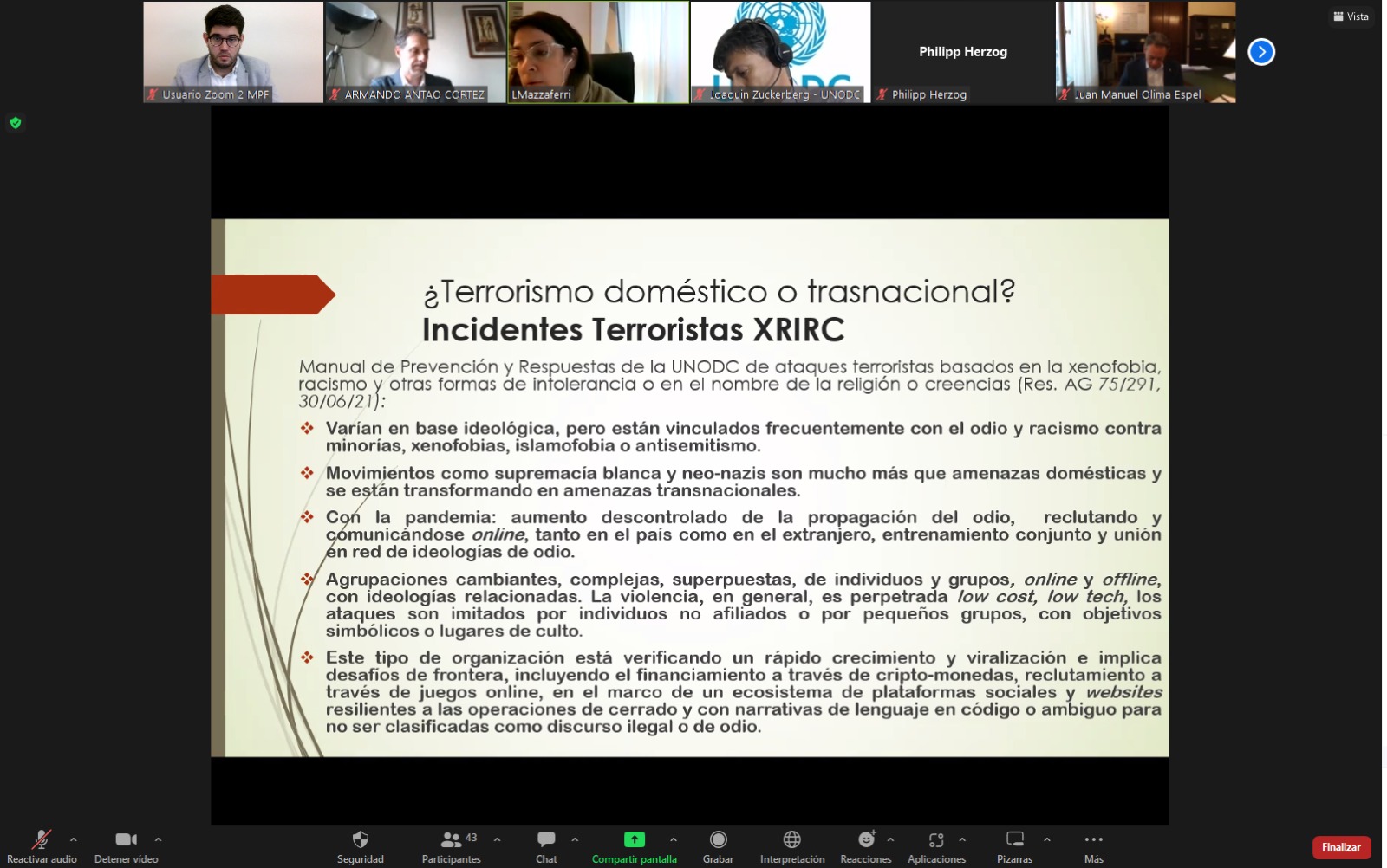 En este contexto, el oficial de Prevención del Delito y Justicia Penal de UNODC, Joaquin Zuckerberg, presentó el manual sobre ataques terroristas sobre la base de la xenofobia, el racismo y otras formas de intolerancia, o en nombre de la religión o las creencias; y explicó las iniciativas internacionales para combatir esta tipología del fenómeno terrorista.